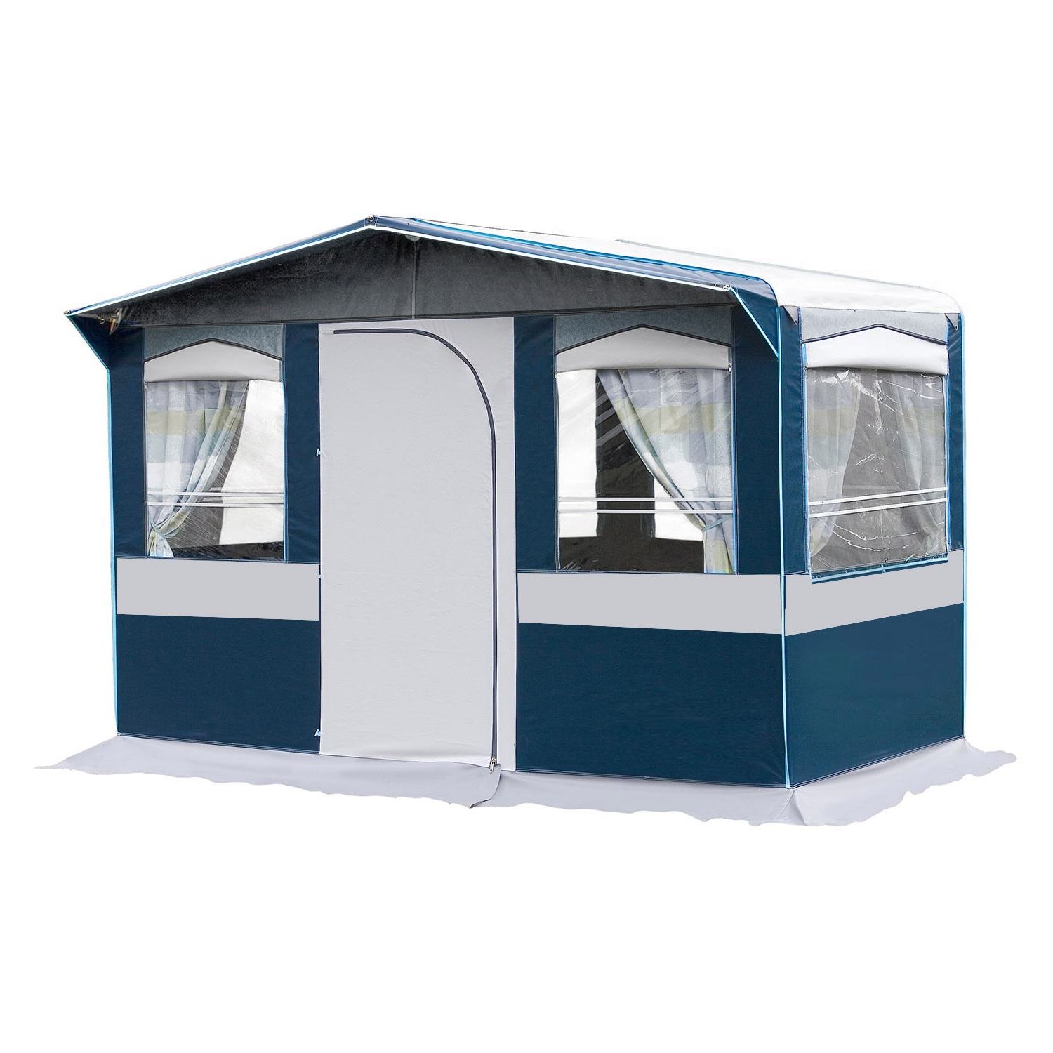 Es perfecta para campings de larga estancia, ya que es más amplia que todos los otros modelos, y se puede amueblar con un mueble cocina con fogones (o incluso dos), un par de neveras de compresión e incluso una buena despensa.